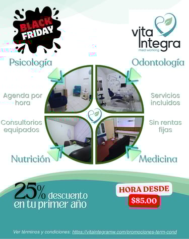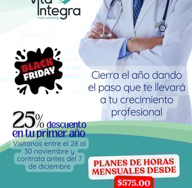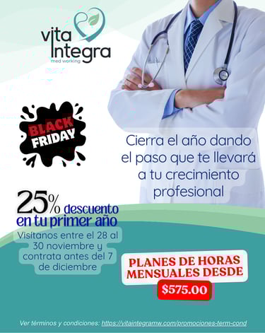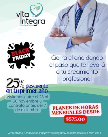 La presente promoción denominada “Black Friday 2025” es una campaña comercial de Vita Integra (en adelante “Vita Integra”) y se apega a los términos y condiciones descritos a continuación. Al contratar un plan bajo esta promoción, el profesional de la salud, (en adelante "usuario") acepta los presentes Términos y Condiciones.