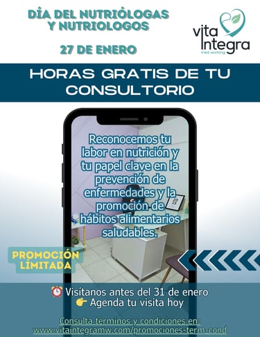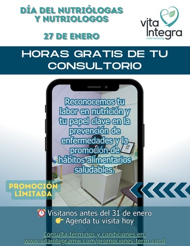 Aplicable únicamente para los profesionales de la salud de Nutrición que visiten los consultorios de Vita Integra entre el 27 y el 31 de enero del 2026 y contraten cualquier plan antes del 7 de febrero, sin excepción.